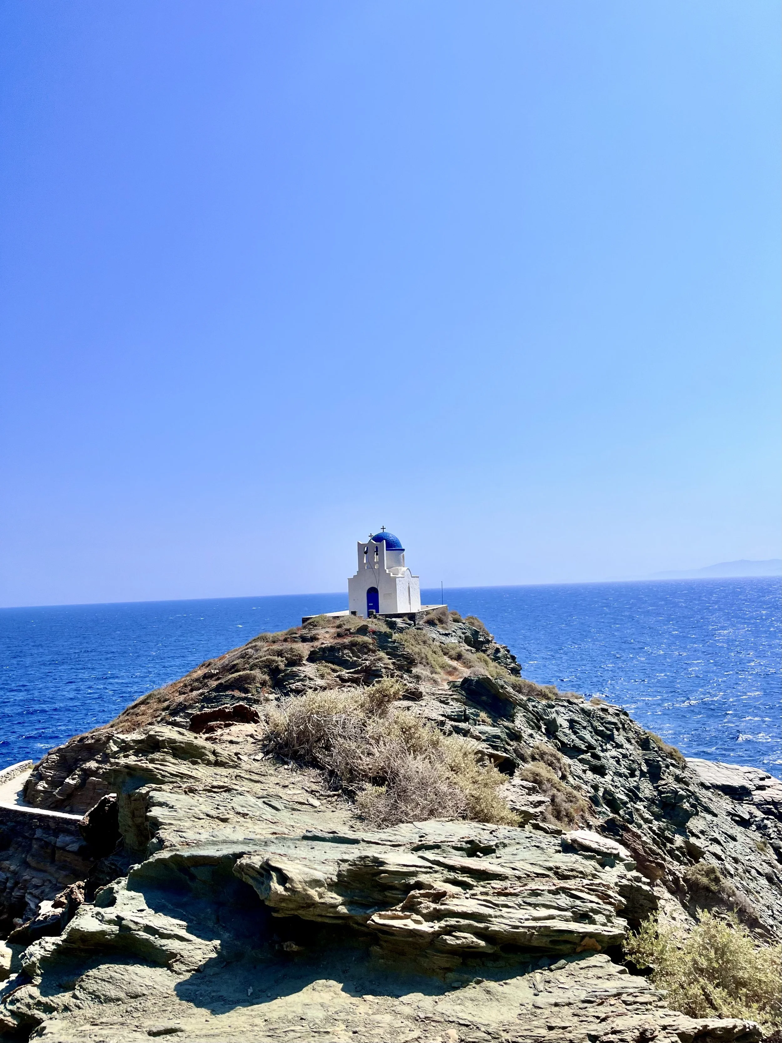 You can see Kastro in roughly a morning or afternoon. I spent the following morning wandering the narrow streets and heading up to the Castle of Sifnos at the top of the village, where you can look out into the Aegean and surrounding mountains whilst learning a tiny chunk of history. A particularly special spot to go and see is the Church of the Seven Martyrs, a tiny blue domed chapel perched on the rocks on the other side of the village. Staring out into the abyss it is visually epic. Please be aware that there is a decent stair decent to get to it, roughly 160 steps, and it’s a tad windy but it’s damn worth it. The chapel only opens for special religious ceremonies or weddings so you can’t go inside but just spending some time down there it gives you a chance to pause and soak in just how wildly mind-blowing these islands can be. You can also get some fantastic photos - so good that they even might become the homepage of your travel blog… . There is also a passage just before the church to get down to the rocks below where on a calm day you could jump in the sea, this is a trek and I would only recommend if you are confident in the water and athletic enough to get in and out.